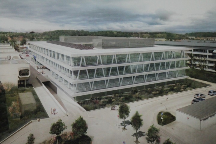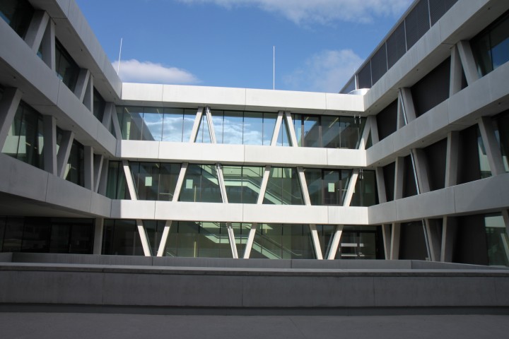In Anlehnung an das denkmalgeschützte Sichtbetongebäude des WIFI Niederösterreich antwortet der Neubau mit schräg gestellten V-Stützen in Beton als von außen ablesbares statisches System, das durch konstruktive Leichtigkeit überzeugt.