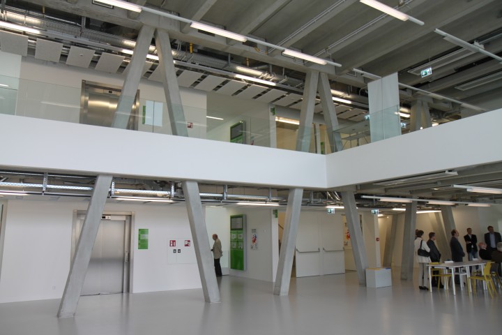 Die gewählte Grundrisskonfiguration der atriumartigen Innenhofsituation sorgt für eine gute räumliche Orientierung und innere Sichtbezüge. Synergetischen Überlegungen folgend werden hier auch die Lehrwerkstätten des WIFI Niederösterreich integriert. Die Flexibilität in der Raumaufteilung gewährleistet Nutzungsnachhaltigkeit, Kommunikation und informelles Lernen. Die bewusste Reduktion in Materialität und Farbgebung soll den Studierenden kreativen Freiraum eröffnen.