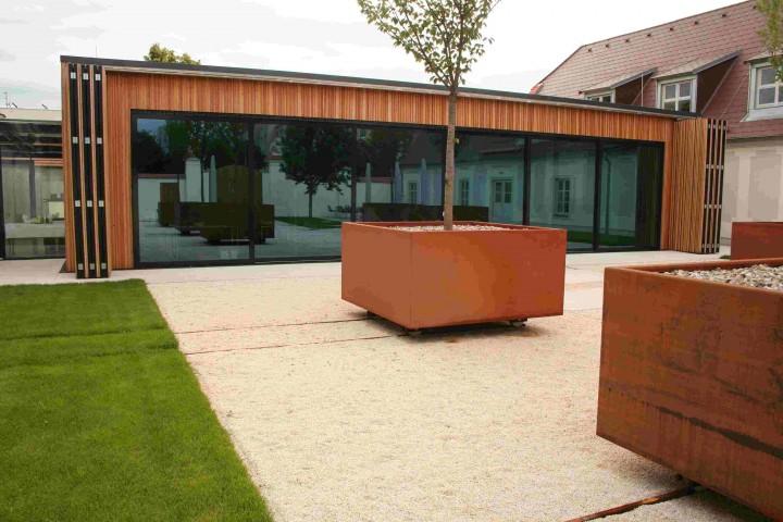 Die nach Ost-West ausgerichteten zwei parallelen selbständigen, alten Bautrakte wurden mit einem neuen verbunden, sodass mit der Portalmauer gegen Westen ein vierseitig umgrenzter und mit mobilen Blumentrögen gestalteter Innenhof entstand. An der Ostseite der Altsubstanz wurde winkelförmig der neu errichtete Hoteltrakt angeschlossen, womit ein nach Süden offener Hof mit der historischen Bausubstanz gebildet wurde.