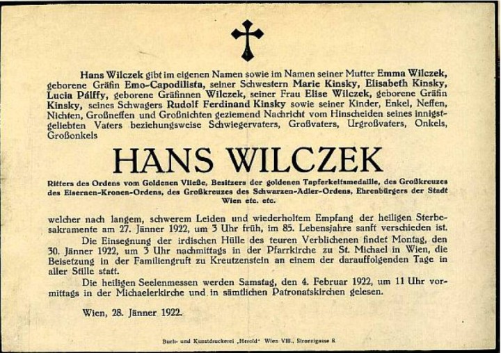 Das Typoskript bildete die seinerzeit in Familienbesitz befindliche Vorlage für das von Wilczeks Tochter Elisabeth Kinsky-Wilczek herausgegebene und 1933 im Verlag Leykam in Graz erschienene Buch "Hans Wilczek erzählt seinen Enkeln Erinnerungen aus seinem Leben".