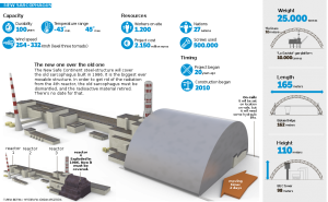 Nachdem der alte Sarkopharg nach 30 Jahren durchlässig wurde, wurde 2010 mit dem Bau eines gigantischen neuen Sarkophargs mit einem Gewicht von 36 000 Tonnen begonnen. Das New Safe Confinement (NSC) ist eine doppelwandige Stahlkonstruktion und soll stabil genug sein, um einen Tornado abzuhalten. Das Gebäude ist rund 165 Meter lang und 110 Meter hoch, der Bogen hat eine Spannweite von 257 Metern.